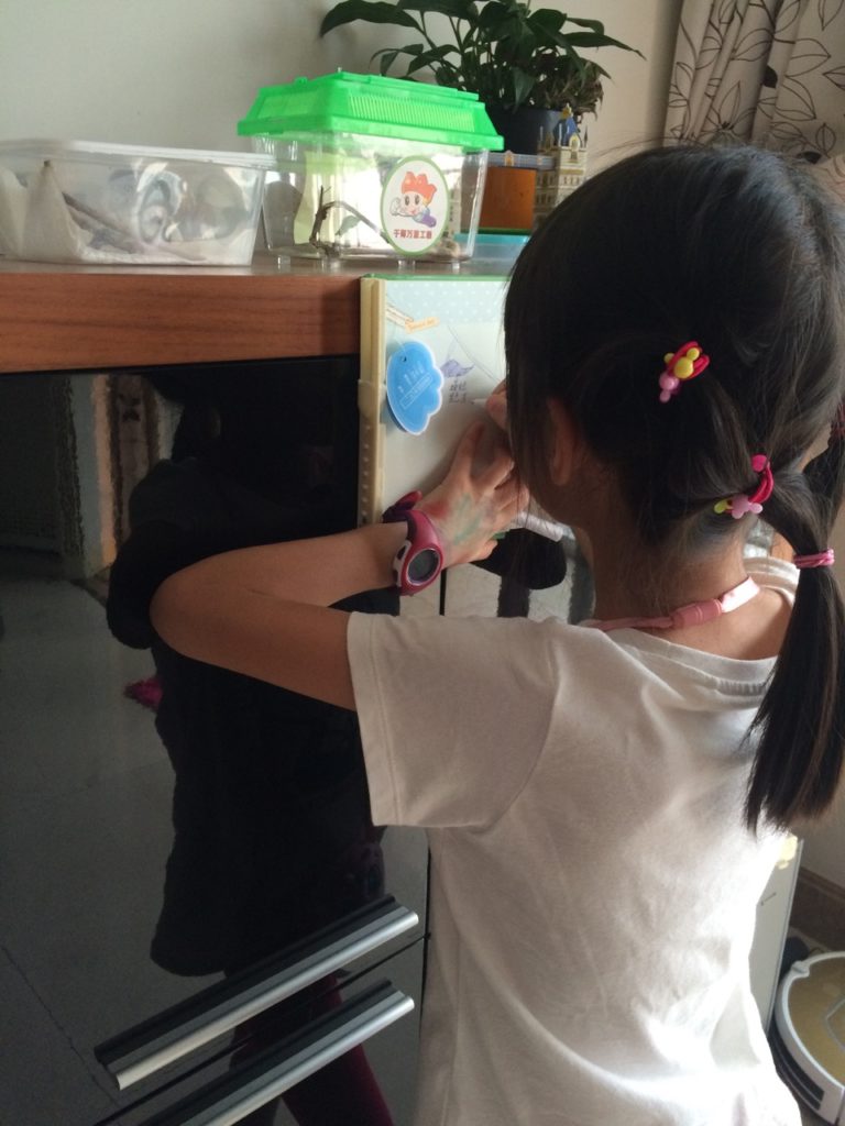 - 小姑娘领养了三周的三只玉带凤蝶陆续化蝶,虽然三次都错过了亲眼看着蝴蝶破茧而出的场面,但是把几个黑不溜秋的小虫卵耐心培育成美丽的大蝴蝶的成就感还是让孩子兴奋了一个星期。Leah一开始捻手捻脚,但是在妈妈耐心的鼓励和引导下,后来也很积极的每天为幼虫宝宝打扫“房子”和喂橘子叶,还拿出本子来记录蝴蝶虫宝宝的成长过程。这样的动昆虫培养实践实在太好,锻炼了孩子的动手能力,也教会了她责任感,同时也给了她很多城市里长大的孩子少有的和自然界一起成长的生活经验。为期三周的孵化过程,对于在快餐式社会环境里生长的孩子来说,可以学习到的第一件事就是耐心。虫卵-幼虫-成虫-化蛹-成蝶的过程不是一天两天完成的,看似发展缓慢,但是你每天的投入会不知不觉中产生影响,最终得到美好的结果。一同参加培养实验的同学,有的一个星期左右就孵化出蝴蝶了,Leah看着虫宝宝还没变色结蛹,有点焦急。我告诉她,虫宝宝发育的每一个阶段都是下一个阶段的基础,这个阶段没有准备好匆匆进入下一个阶段反而是不健康的,我们要做的事情是在每一个阶段里做好我们该做的事情,当条件成熟大自然会让它进入下一个阶段。我们人类的成长和学习也是遵循同样的道理,根据自己的情况做好自己的本分,生活是不会辜负你的努力的。