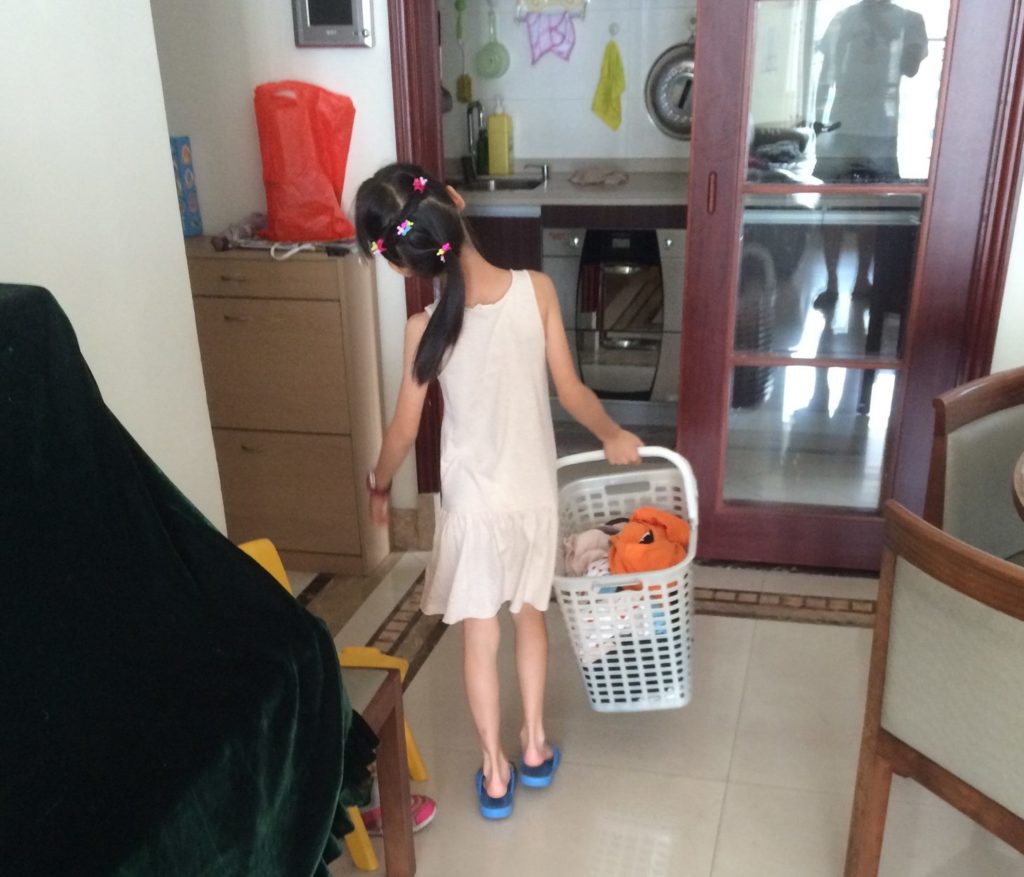 第一天我回到家,Leah已经做完功课,在看书,我要做晚饭了,但是浴室里堆着的衣服还没洗,于是我叫Leah帮忙把衣服放到洗衣机里洗,她很爽快地答应了。我口头指示她如何加洗衣液、如何选择洗衣程序,倒洗衣液的时候洒了一些到地上(洗衣液的大瓶子小朋友不好操作),我说“没关系,一会儿擦干净就可以了”,然后她又小心翼翼的按照我的指示按那一堆按钮,按下“开始”之后,我看到小姑娘很有满足感的笑容。洗衣结束的时候我在炒菜,于是只能叫Leah晾衣服,她也很爽快地动手了,看到她吃力而专注地举着晾衣叉的样子,欣慰的表情在我脑里刷屏。